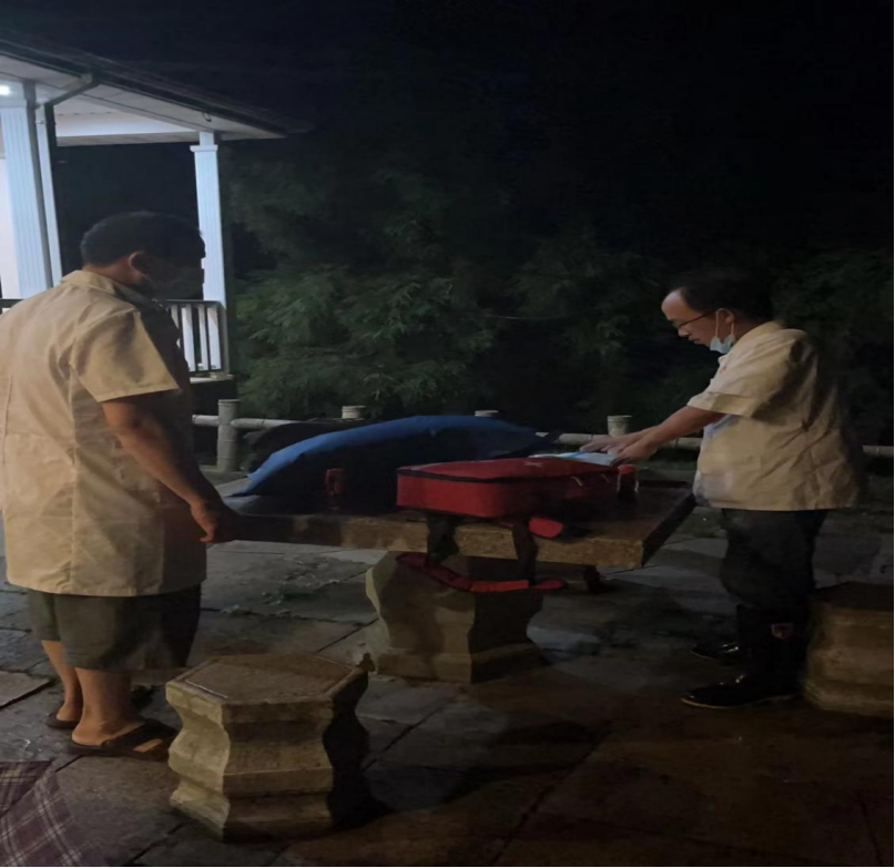 得悉萬(wàn)女士的緊急狀況,指導(dǎo)員第一時(shí)間聯(lián)系了景區(qū)綜合執(zhí)法大隊(duì)大隊(duì)長(zhǎng)劉運(yùn)中,劉運(yùn)中接到匯報(bào)后立刻安排天柱山急救站醫(yī)護(hù)人員與執(zhí)法隊(duì)員、景區(qū)派出所工作人員一起前往煉丹湖接待中心進(jìn)行救助,安排客運(yùn)公司人員駕駛急救車輛在大龍窩游客出口待命,同時(shí)向景區(qū)管委會(huì)相關(guān)領(lǐng)導(dǎo)和市疫情防控指揮部進(jìn)行了匯報(bào),并奔赴景區(qū)現(xiàn)場(chǎng)指揮救助。于是,雷雨交加的景區(qū)山徑夜幕中就出現(xiàn)了一群打著手電筒行色匆匆的一群人。
