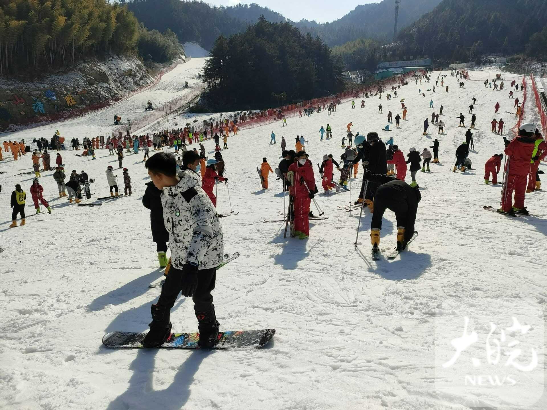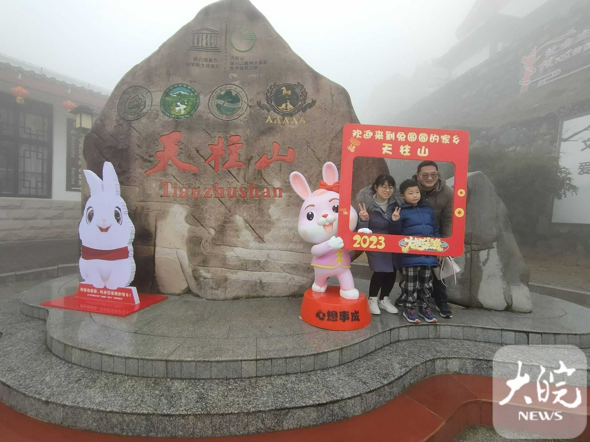 春節(jié)假期,天柱山風景美,年味濃,景區(qū)在馬祖、茶莊游客中心、天池峰等多處設有歡慶新年的“兔圓圓”卡通形象,游客在這里拍照,許下美好愿望?!敖衲甏汗?jié)帶著家人在天柱山旅游過年,提前在網(wǎng)上預訂好民宿,一家人開心快樂地體驗山岳風情,吃農(nóng)家菜、看民俗、滑冰雪、賞美景,體驗“慢生活”,在“兔圓圓”故鄉(xiāng)過兔年,意義非凡?!眮碜陨虾5挠嘞壬_心地說。