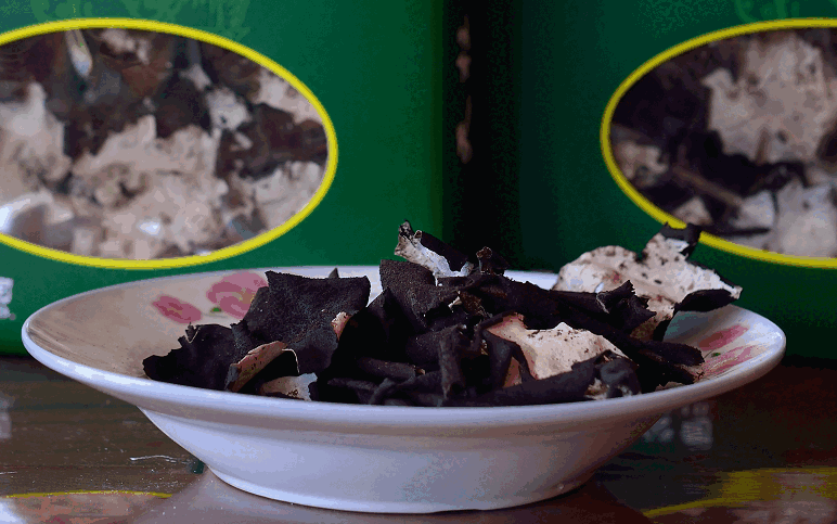 屬地衣門石耳科,菌體葉狀,正面為灰白或灰綠色,反面為黑褐色,多生長于海拔700-2000米懸崖峭壁的陰濕石縫間。石耳常以小群落的形式分布,少則幾片,多則百余片。一公斤干石耳約1400片左右,因而極其珍貴。石耳的藥用價(jià)值很高,《神農(nóng)本草經(jīng)》就把它列為上等藥材。其主要成份有氨基酸、卵磷質(zhì)和多種微金屬元素。有滋陰潤肺、治療高血壓和各種熱癥等攻效,對(duì)抑制腫瘤、出血也有積極作用。同時(shí)石耳亦可佐菜食用?!笆鸁跫佐~”、“石耳烏雞湯”等乃為上等佳肴。天柱山地處江淮之間,氣候溫和、雨量充沛,終年云霧繚繞,且境內(nèi)群山環(huán)繞,海拔千米以上的雄峰45座,是石耳生長的理想之地。