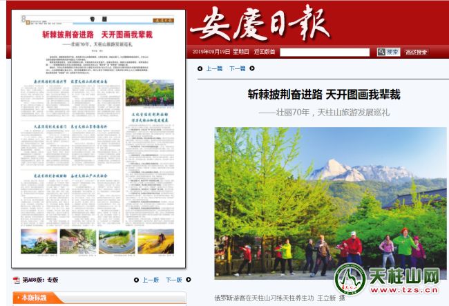 金秋的風(fēng),滿載著收獲的氣息,親撫著天柱山的滿目錦繡。從養(yǎng)在深閨,到走出國門,從步履蹣跚到超邁前行,天柱山以全新的面貌和累累碩果向新中國成立70周年獻禮!